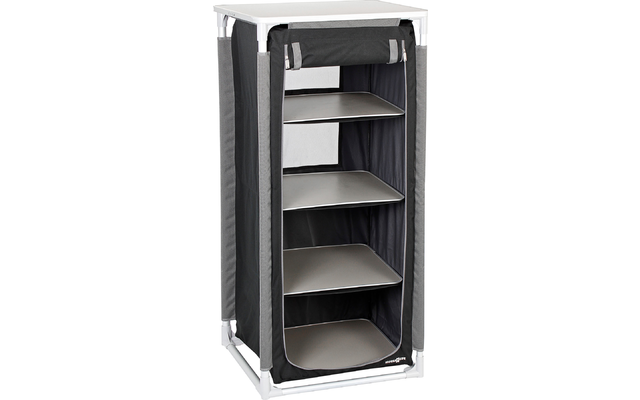 Alu-Mehrzweckschrank mit Innenablagen. Den oberen Abschluss der stabilen Konstruktion bildet eine Ablageplatte.