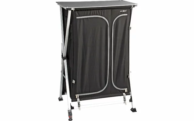 Gran armario multifuncional de camping con 2 compartimentos separados con cremallera y 6 estantes interiores. El compartimento más estrecho también puede convertirse en armario gracias a las baldas divisibles del centro y a la barra de colgar incorporada. Diseño muy robusto con bastidor transversal de aluminio y perfiles rectangulares resistentes a la torsión. Las paredes delantera y trasera pueden estabilizarse adicionalmente mediante un dispositivo de sujeción especial. Los amplios reposapiés giratorios evitan que el armario se hunda en suelos blandos o que se dañe el suelo o la moqueta de la tienda. Un pie regulable en altura permite una perfecta nivelación en caso de suelos irregulares. Una ventana de gasa en la pared trasera proporciona ventilación interior al armario. Con práctica bolsa de transporte y almacenamiento.