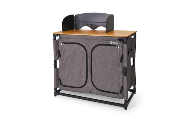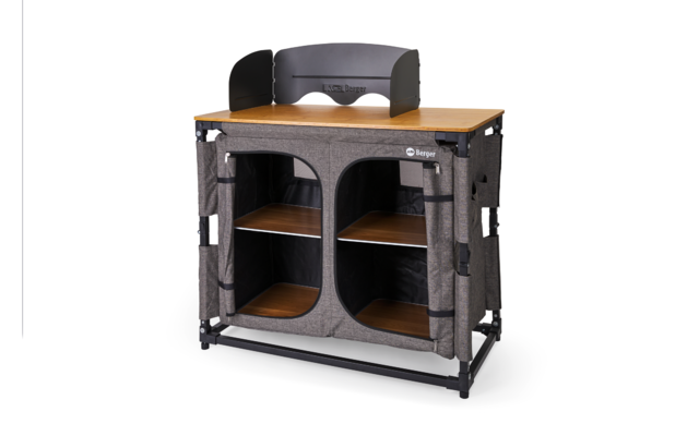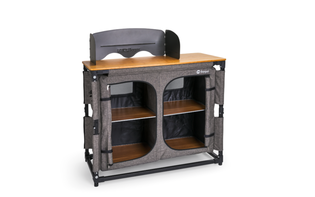 La caja de cocina … impresiona por su versatilidad para su reducido espacio. Detrás del cortavientos, podrá preparar cualquier plato en la encimera de 100 cm de largo durante sus vacaciones. En el gran compartimento de almacenamiento hay espacio para muchos accesorios en dos niveles y en los dos bolsillos laterales.