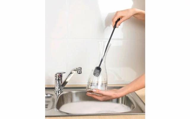 El pequeño cabezal hace que el cepillo de limpieza sea especialmente adecuado para enjuagar botellas, jarras, jarrones y garrafas. Incluso los lugares de difícil acceso, por ejemplo en las botellas estrechas, se limpian a fondo con el cepillo con púas