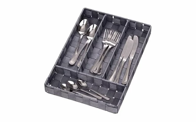 Fabricada con un moderno diseño de mimbre plástico gris de alta calidad, la cesta cabe en cualquier cajón estándar. Los cuatro compartimentos separados para los cubiertos permiten guardar de forma clara y separada cuchillos, tenedores, cucharas, cucharillas o cuchillos de cocina