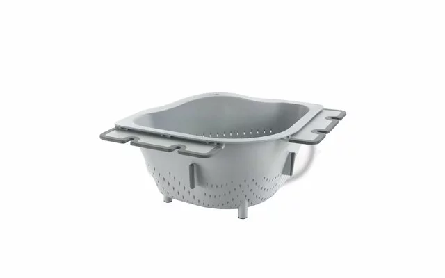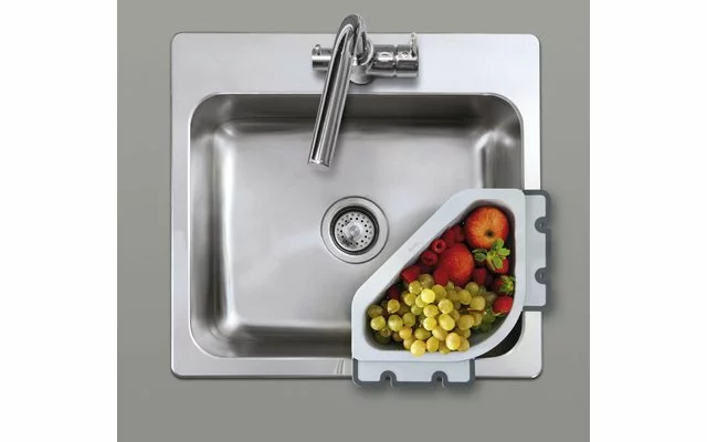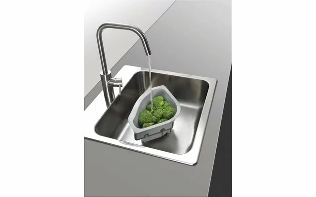 Colador de esquina Drain-On de plástico, con aletas antideslizantes variables para su fijación al borde del fregadero.