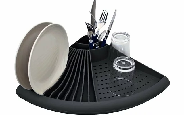 Puede utilizarse como escurreplatos y como escurridor. Ahorro de espacio gracias a su forma angular.