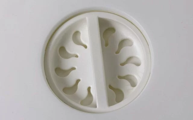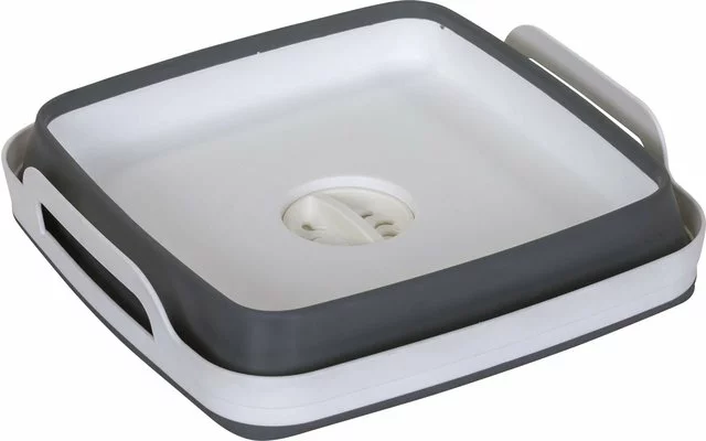 Lavabo plegable con salida de agua integrada y asas de transporte.
