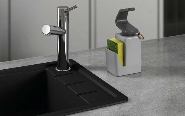 El dispensador se puede rellenar fácilmente una y otra vez y se maneja con el dorso de la mano para un uso higiénico. El dispensador está equipado con un práctico soporte para esponjas, un ingenioso soporte para anillos y una base antirretorno.