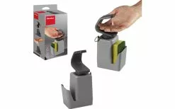 El dispensador se puede rellenar fácilmente una y otra vez y se maneja con el dorso de la mano para un uso higiénico. El dispensador está equipado con un práctico soporte para esponjas, un ingenioso soporte para anillos y una base antirretorno.
