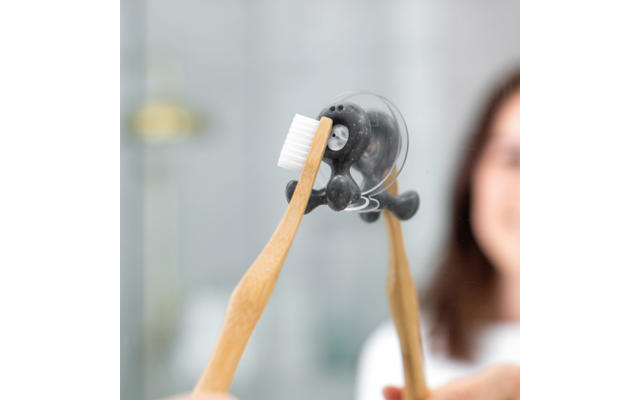 Los cepillos de dientes pueden quedar sueltos aquí. TOMMY extiende ambas patas y ofrece una sujeción fresca y aireada para los cepillos de dientes. Una solución rápida y que ahorra espacio, especialmente para baños pequeños. El soporte para cepillos de dientes se fija simplemente a la pared con una ventosa, sin esfuerzo de instalación ni perforación de azulejos.