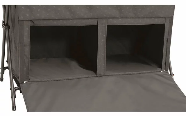 El armario de camping plegable Aruba en gris con 4 compartimentos de almacenamiento y 2 compartimentos de red es ideal para guardar los accesorios de camping. La robusta puerta abatible con asa ofrece un espacio de almacenamiento fácil de usar, como en casa. La puerta está equipada con un cierre magenta. En el lateral también hay un práctico organizador y un gancho para colgar cosas. El armario de camping puede utilizarse solo o junto con el organizador Neat´n´ Tidy. Bolsa de transporte incluida para facilitar el almacenamiento y el transporte.