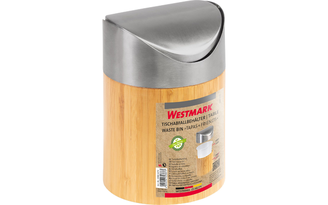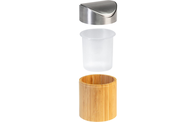 Atractivo y elegante minibasurero de bambú con tapa abatible de acero inoxidable e inserto de plástico extraíble, para su uso en la hostelería o en el hogar, para la eliminación práctica e higiénica de los residuos de mesa y co.