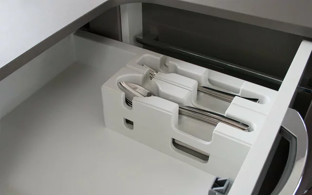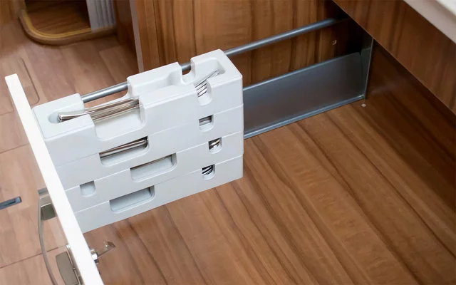 Gracias al sistema modular, los insertos de los compartimentos individuales pueden adaptarse a una gran variedad de cajones según las necesidades y la anchura. El ingenioso inserto para los cubiertos aprovecha al máximo el espacio disponible. La cubertería puede estar claramente dispuesta. El práctico apilamiento permite una mejor utilización de los cajones estrechos o más pequeños. Especialmente adecuado para vehículos pequeños, por ejemplo, furgonetas. La estiba horizontal protege los cubiertos, especialmente las hojas de los cuchillos, de posibles daños