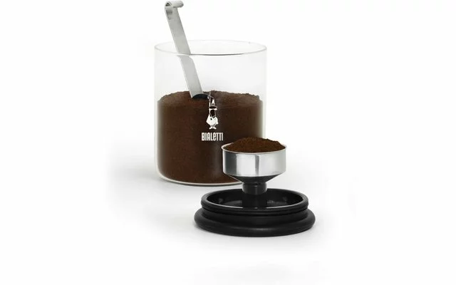 Almacenamiento seguro de un máximo de 250 g de café. La tapa también ayuda a llenar el embudo de café Bialetti mediante el soporte correspondiente.