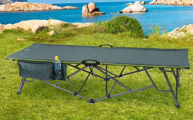 Robusta tumbona plegable con práctico organizador. El pequeño tamaño del paquete convence durante el transporte. La tumbona se puede volver a plegar muy rápida y fácilmente. Ideal para dormir en posición elevada y así proteger también de los insectos que se arrastran por el suelo.
