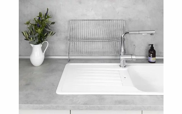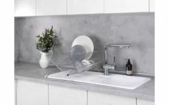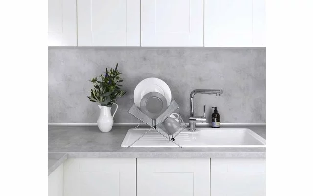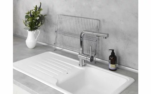 El práctico escurreplatos Duo de metal cromado ofrece mucho espacio para platos y vajilla con sus amplias superficies de almacenamiento. Dado que incluso en la era de los lavavajillas sigue habiendo platos y cubiertos que se lavan mejor a mano, sirve como accesorio funcional para el fregadero de la cocina, la casa de verano o la casa móvil. Gracias al diseño en forma de cruz, los platos encuentran un soporte óptimo en el estante superior. El estante lateral ofrece espacio para tazas, vasos más pequeños o cubiertos. Cuando no se utiliza, el escurreplatos se puede plegar para ahorrar espacio.