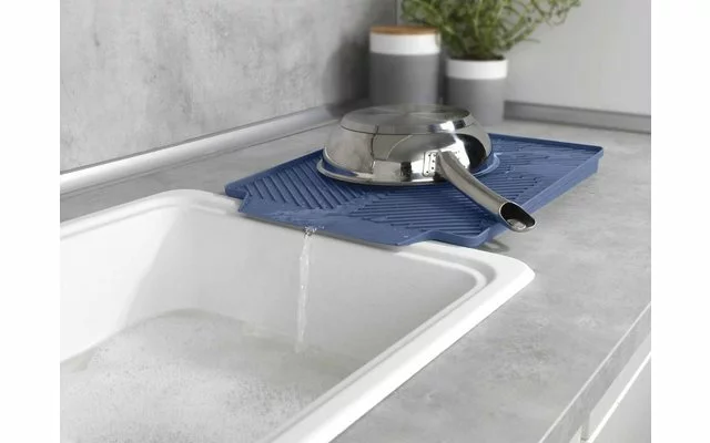 La superficie inclinada permite que el agua de aclarado escurra de forma óptima. Así se evitan los charcos en la estantería y las marcas de cal en los vasos. Los platos se secan más rápido. La práctica alfombrilla escurreplatos está fabricada en plástico resistente y se presenta en un moderno color azul o gris (según la versión). Por supuesto, Wenko ofrece muchos otros ingeniosos aparatos de cocina en azul o gris a juego. Este aspecto convierte la cocina en un verdadero lugar de bienestar.