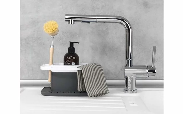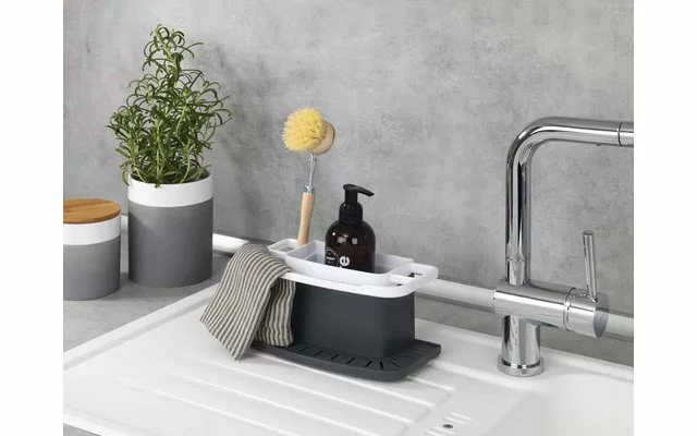 - claramente organizado: El organizador ofrece una barra de secado separada para el paño de cocina, un recipiente para el líquido lavavajillas y mucho espacio en el lateral para el cepillo de fregar, la esponja